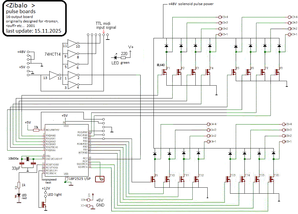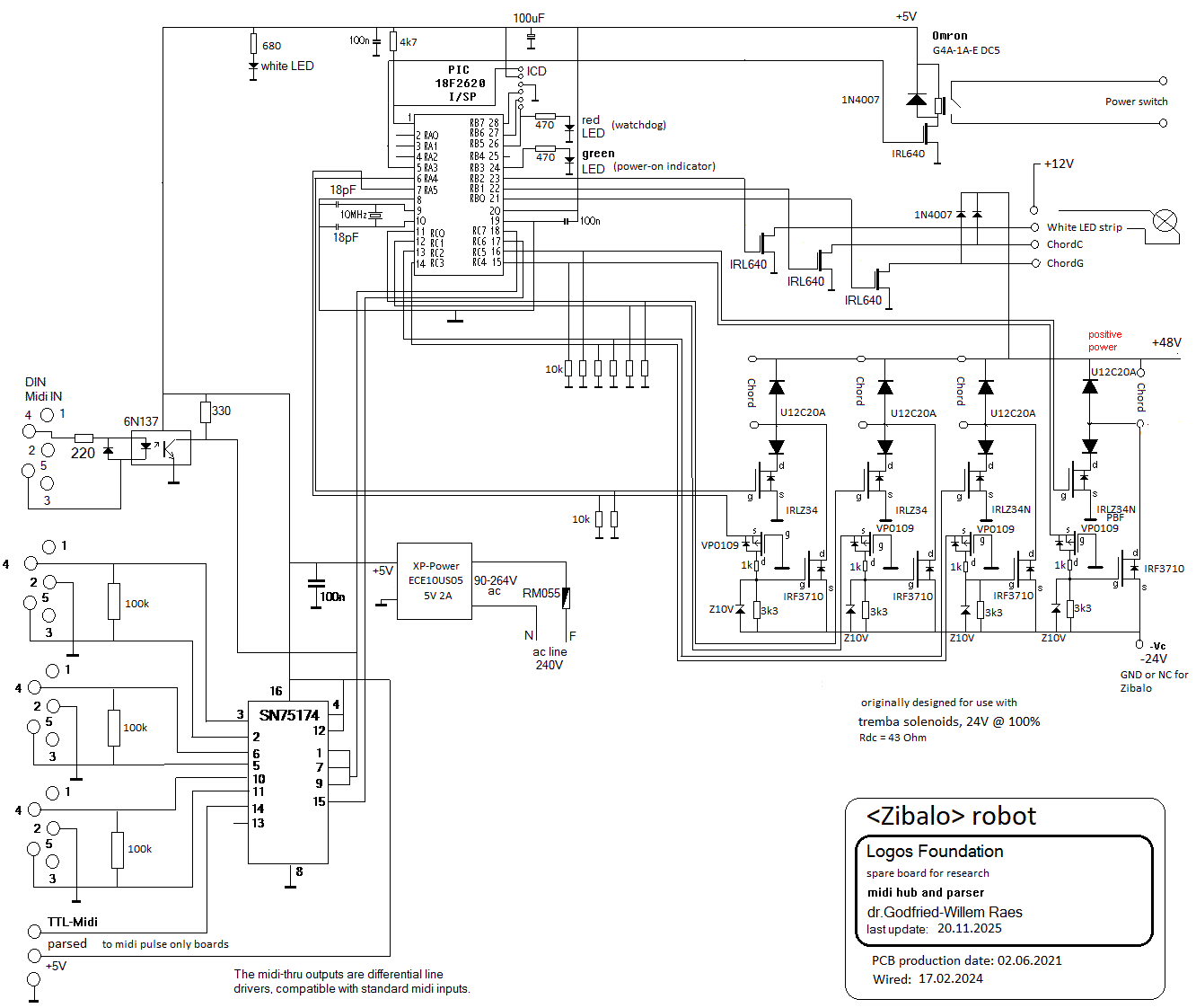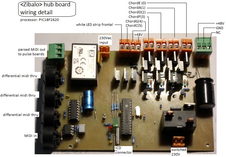 Wiring & circuit details midihub board, servicing the six chord hammers