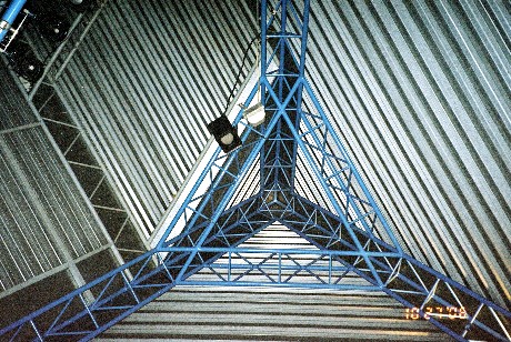 The Logos tetrahedron is one of the very few concert halls built by musicians themselves. Musicmaker Dr.Godfried-Willem Raes, the director of the Logos Foundation, was its designer. The actual realization of the building too (welding, cementing, plumbing, painting etc.) was done by the Logos work group. They spent six months in 1990 tearing down the old factory buildings and then it took them another half year to erect the new space using steel, concrete and plate metal. The balcony is covered by transparent grids in such a way the whole construction appears extremely light and elegant. The metal roof is entirely covered from the outside by thick layers of insulating and dampening polyurethane.