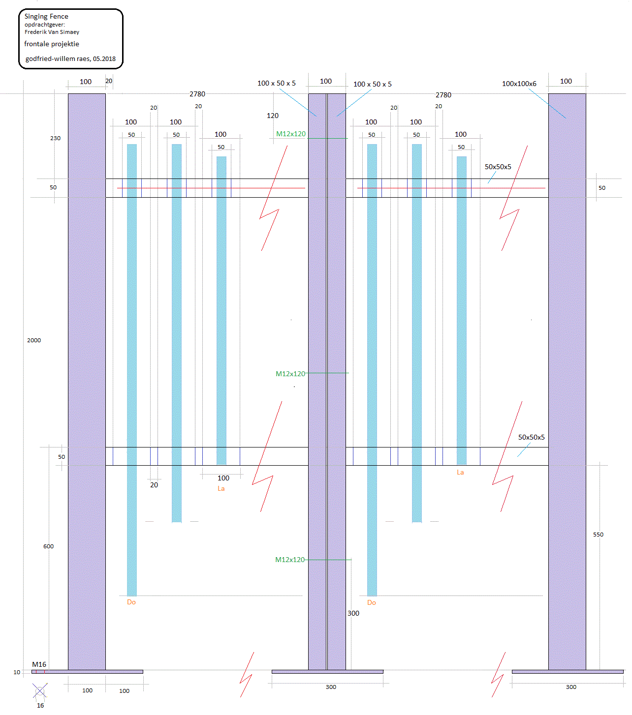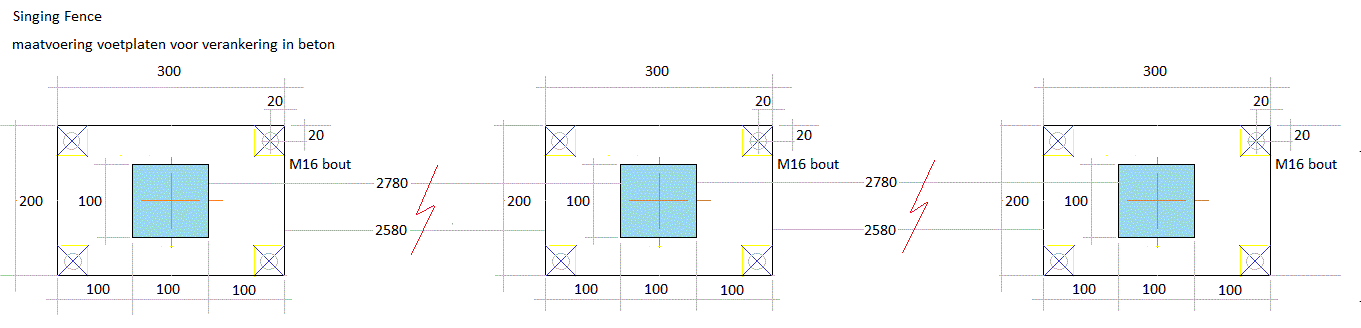de verankeringsgaten M16. Uittekenen hoogteplan op schaal. Laswerk