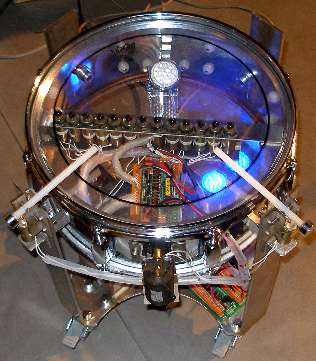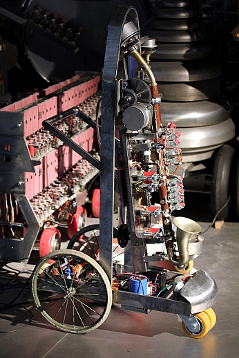<Korn> is een klein maar vinnig kornet-robotje en <Snar> een geautomatiseerde snare drum waarvan je alle hamers, kloppertjes en lichtjes ziet spelen.