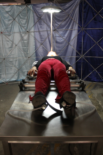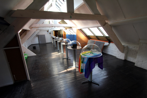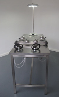 Oorwonde is as much a tactile experience as an auditory one as the sound waves emitted are designed to be experienced as sensations. Constructed in stainless steel with an operating lamp that beams a clear-cut bundle of white light, Oorwonde reflects its surgical allusions. At first sight, the sound work might induce feelings of fear. The actual experience is a rather pleasant one and unlike a surgical operation, the 'patient' is in full control.