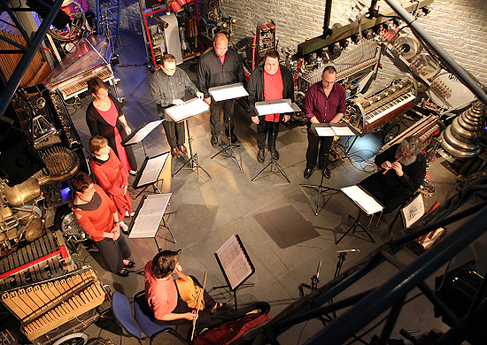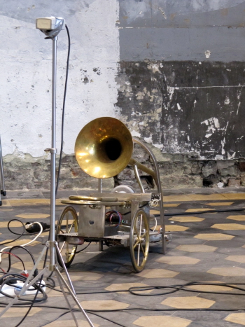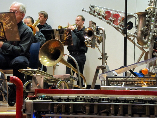 Automaton orchestra with dancers, performers and musicians: Dominica Eyckmans, Barbara Buchowiec, Moniek Darge, Sebastian Bradt, Xavier Verhelst, Helen White and Kristof Lauwers, directed by Godfried-Willem Raesmore information on the M&M Orchestra