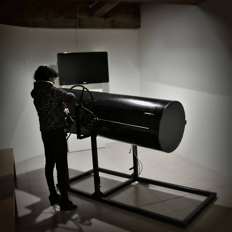 De cabine wordt horizontaal gebracht en de bezoeker wordt omringd door de sonificatie van zijn eigen hersengolven.