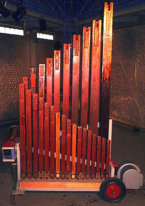In this new acoustic project by the Logos Foundation, 24 children can play simultaneously. A foot pump is attached to each foot (48 foot pumps) that serves as a bellow. The foot pumps allow to differentiate the air supply to the organ pipes, and thus to play loud or silent.
