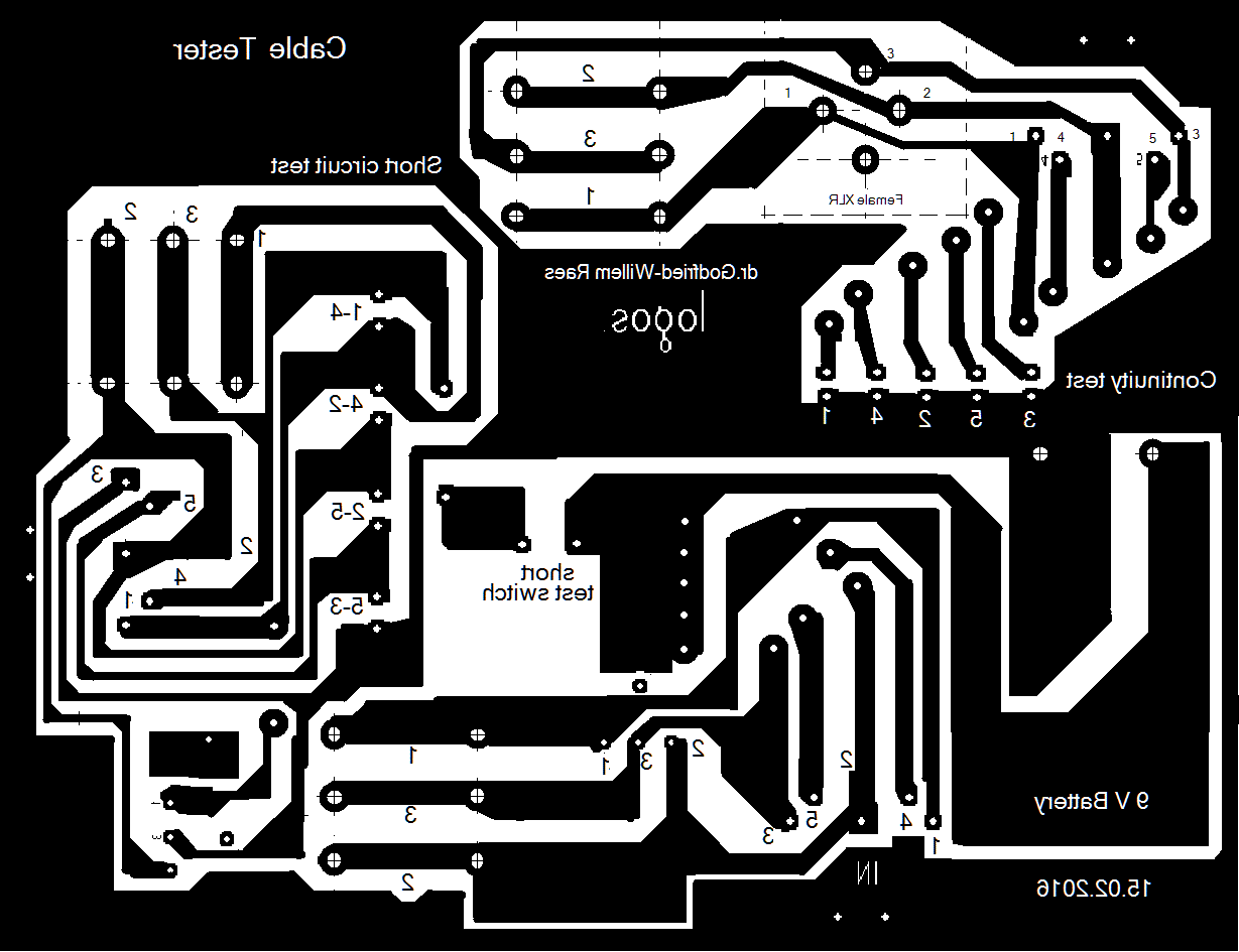 If you want to etch it, save the gif image on your computer and laser-print it on transparent foil reduced to 50% in size. Assembled testers can be bought from the Logos Foundation for approximately 50 Euro's. Here is a picture of a finished circuit: