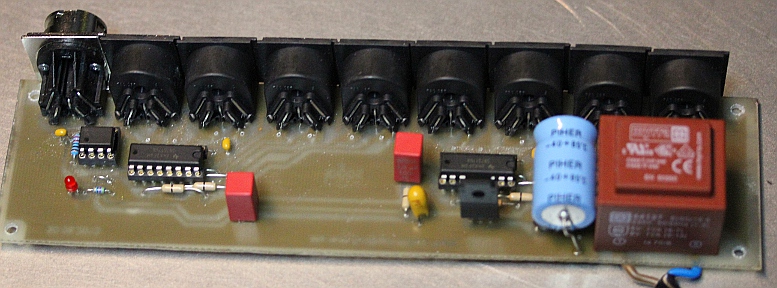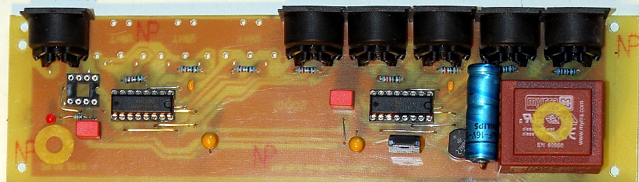 So with two of these circuits (in fact the receiver and the transmitter make use of the same PC board, with only a few jumpers placed differently) we can have our 8 port midi device active on any reasonable distance. The midi-in violates the MIDI standard in that there is no optocoupler. In fact we maintain the optocoupler only at the very end of the signals destination, that is on the robots themselves. The only remaining problem is that the differential inputs do not work with standard midi, the standard midi-out signal being inherently non balanced. As long as we do not use differential receivers on standard midi-out's the problem can be circumvented.