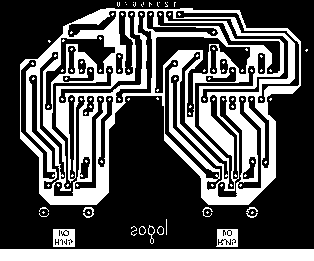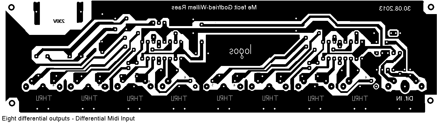The hubs as well as the buffers use SN74174 quad differential drivers. The buffers have true differential inputs using the SN75176 chip whereas the hub's receive a TTL midi signal directly from the midi-interface. All circuitboards have individual floating power supplies, so ground loops cannot occur. Readers interested in building up these circuits can make use of our PCB designs. They are single sided boards and can easily be produced at home. They should be printed at 50% scale on transparent film as used for overhead projectors.