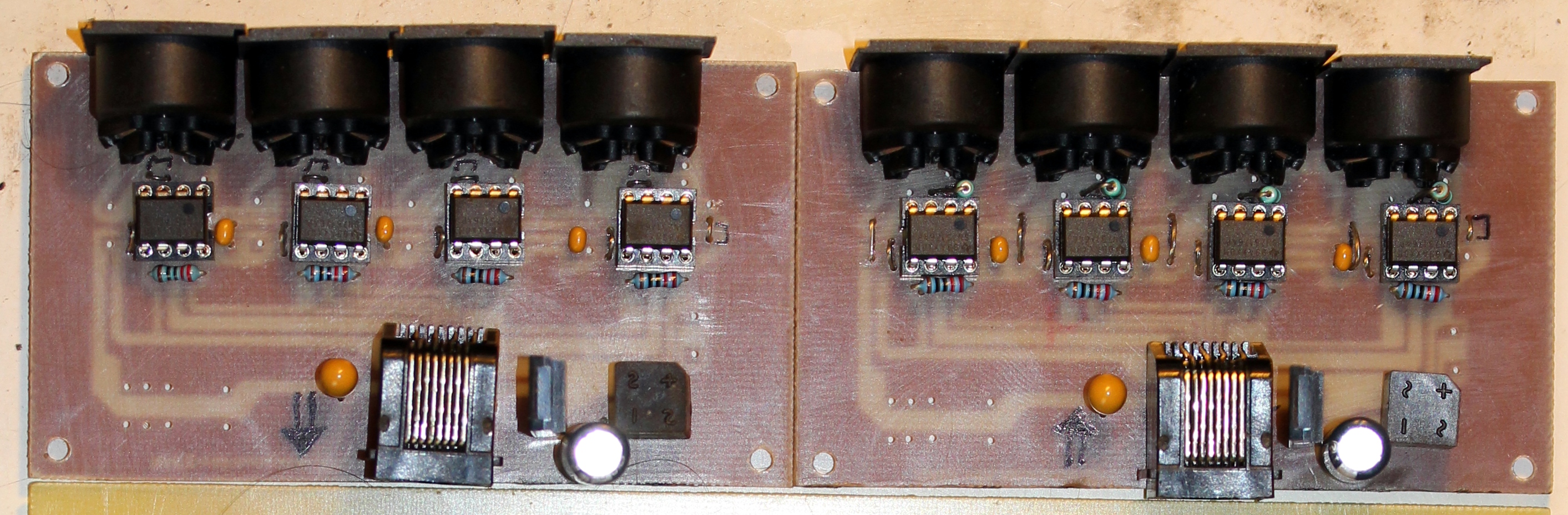 - Quad line tranceiver board (can be configured either as driver or as receiver) for RJ45 connector and CAT5 cable. A couple of these boards -one wired for output, the other for input- can be seen in the picture below:
