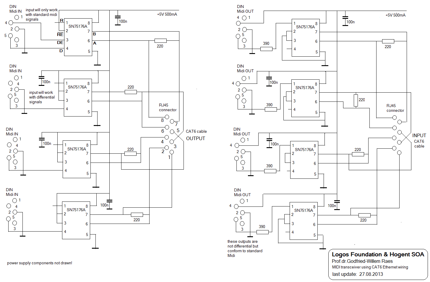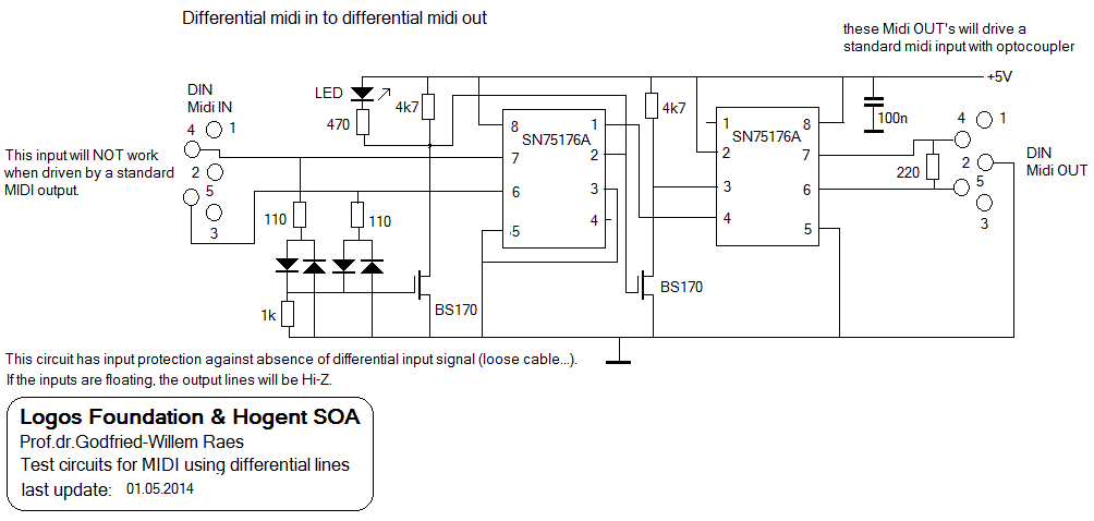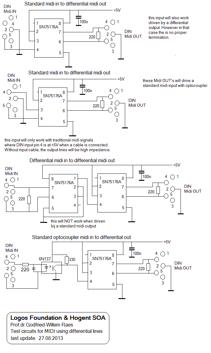 In this new design we use true differential bus transceivers, more specific SN75176 components and implement a RS485 protocol with the MIDI baudrate. The A and B output lines (if configured as outputs by bringing pins 2 and 3 high) can directly drive a traditional midi-input with its optocoupler. Line termination can become an issue and if the outputs are not driving a midi opto-coupler, it would be best to have a 220 Ohm load resistor soldered between DIN pins 4 and 5 on the input. Midi signals are too slow to consider the wiring a real transmission line requiring proper termination, but to maintain the steepness of the square wave signals throughout the transmission we concluded thats is much better to just do so. Obviously normal midi cables do not have a specified characteric impedance, so the value of 110 Ohms is rather arbitrary and only chosen to match standard CAT5 cables.