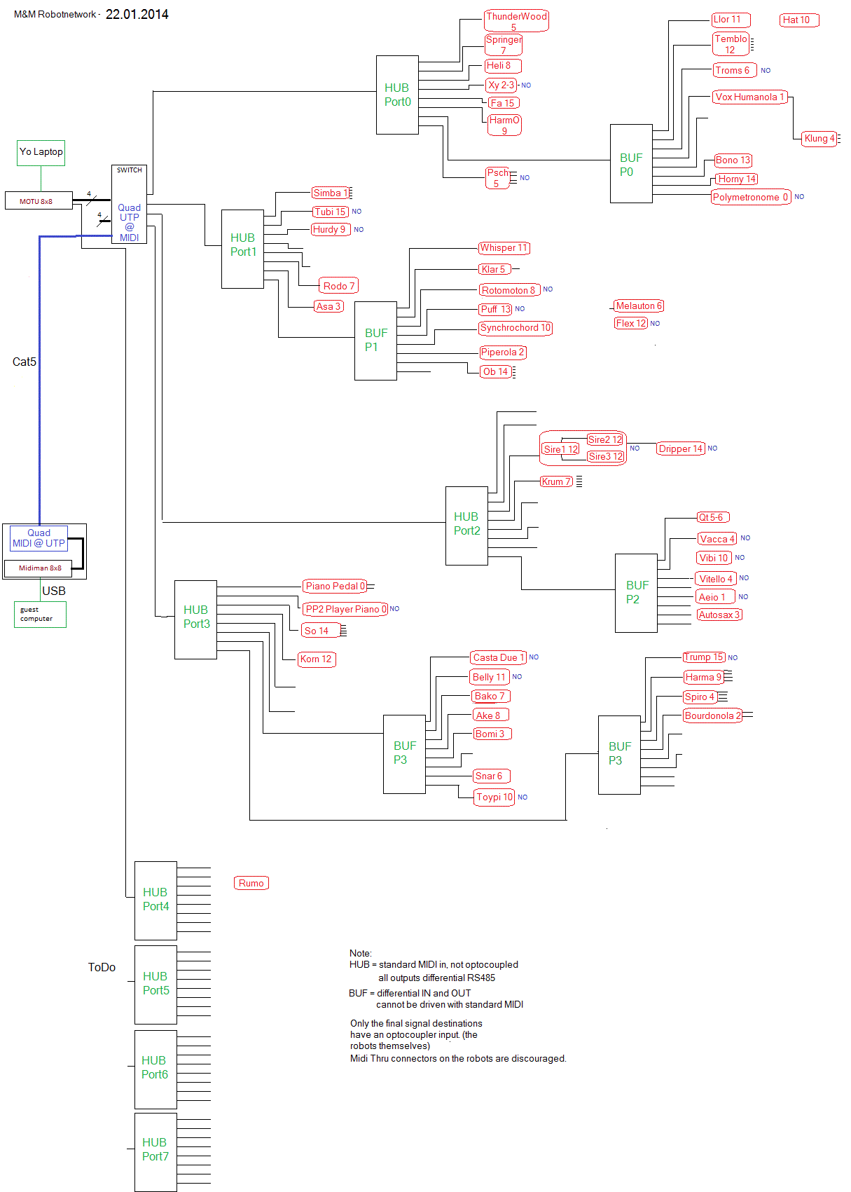 In 2013 we undertook a project for a complete hardware revision of MIDI data transfer. However, we wanted to preserve standard MIDI compatibility for all the individual robots, thus the optocouplers and the 5mA current loop driving a midi input ought to be preserved. The reasons behind the revision were: First of all, to overcome the signal degradation caused by the pass through way too many optocouplers we were experiencing in our work with the robot orchestra, at this point (august 2013) consisting of 56 musical robots. Second, to solve the problems with cable lenghts, limited to 10 meters in standard MIDI.. Symptoms for signal deterioration are typically: missed note-off commands: stuck notes. The binary midi code for these commands contains a long series of 0's and the receiver UART tends to get out of sync. If you are not immediately convinced, look at the binary equivalent of the code sequence for note 64 off on channel 0: 1000 0000 0100 0000 0000 0000. The slightest bit of jitter on the only two one's in this train will guarantee you a missed command.