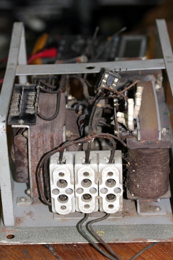 We measured the wire gage on the saturation transformer Tr1 secondaries as 1 mm diameter. The DC resistance of both windings in series equals 0.8 Ohm. If we assume a current density in the copper wire of 3 A/mm2, this would indicate a current rating of 2.5 A. This seems consistent with the size and weight of the transformers, indicating a power between 65VA and 100VA. None of the output terminals are grounded, thus the voltage is floating versus the chassis. There is no mains grounding provision neither, but presumably the entire unit was built into a steel cabinet that itself was connected to mains ground. Note that the device still works today! If we would change anything, it would be the leaky selenium rectifier by replacing it with a silicon type, and the two electrolytic capacitors. We would at the same time increase their value to at least 10mF, thus improving the ripple reduction achieved with the Pi low pass filter using a choke considerably. Capacitors with such high values were simply not available at the time this supply was designed and build. By selecting one of the ten taps provided on Tr2's secondary, the voltage can be set to voltages in the range 25 to 35V. The mains voltage can be 220, 190, 130 or 110Volts. All measurement data come from us, as no documentation could be traced.