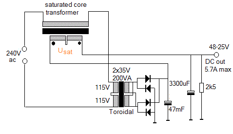 An old recipe for a stabilized power supply without using semiconductors nor vacuum tubes: the saturated core transformer.