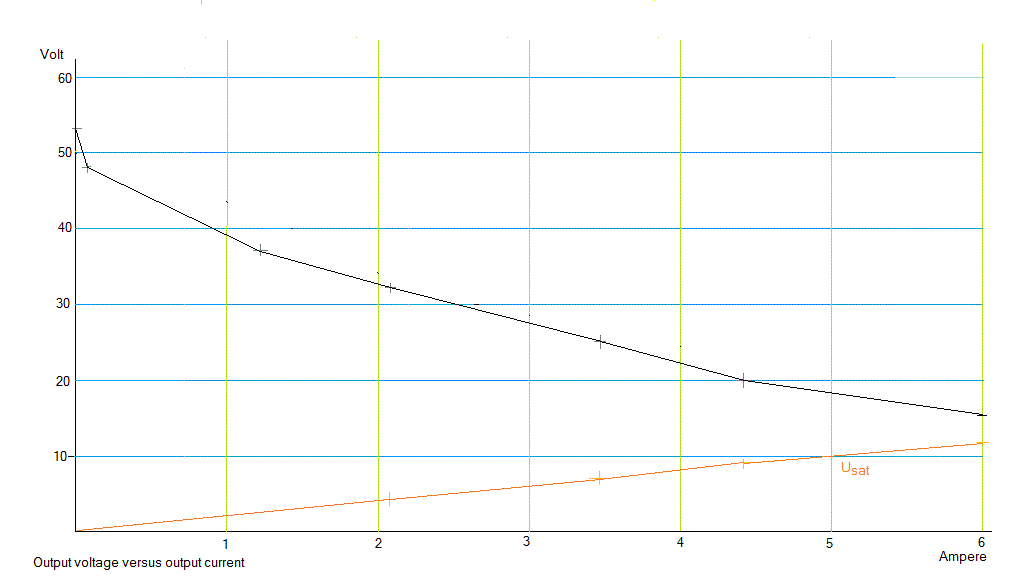 This curve was obtained with a 50 Ohm / 200W variable rheostat as a load. A noticable mechanical hum -proportional to load current- was noticed from the saturated core transformer. This hum is clearly not caused by our chassis, as we made it from stainless steel. Only impregnation of the windings with epoxy rosin could improve this. It will be clear that regulation gets better as the current is increased. For the components used here, the maximum output current should be limited to 5.7 A. The 2.5 k wire wound resistor on the output serves as a 'preload' limiting the open voltage output to 48V as well as for decharging the capacitors when the power supply is switched off. An incandescent bulb of a suitable value at this place could further improve regulation. The curve drawn in orange gives the DC voltage measured over the saturation winding of the transformer. DC resistance of this winding equals 0.8 Ohm. As predicted by Ohm's law, this is nearly a straight line. The slightly downward curve near the right is caused by the increasing resistance of the coil as it starts warming up.