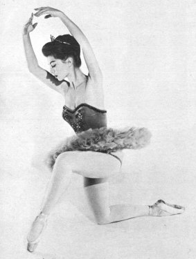 The same dancer is photographed twice each time, in the same dance position. Once in a kitsch nineteenth-century style costume and once simply naked.