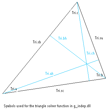 This function solves arbitrary triangles, given 3 elements, if possible. Look into the declaration of the triangle (cfr. g_type.bi) structure for documentation. The figure below can be used as a point of reference to understand the parameters of the function: