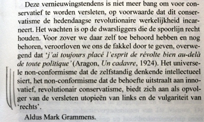11.11.1999: De administratieve piramide -bestaande uit uitgerekend de minder bekwame en gemotiveerde onderwijsmensen- heeft zichzelf verbreed en gepromoveerd: zij zijn het die zichzelf de hoogste weddeschalen toekennen, terwijl diegenen die het eigenlijke werk goed doen, worden gedegradeerd tot subjekt en slaaf van hun administratieve waanzin. Hun middelen worden stelselmatig ingeperkt en beknot. Dat is het netto effekt van de grotere autonomie die de hogescholen door de recente dekreten werd toegekend...12.10.1999: Je zou kunnen stellen dat het serialisme in de 2e helft van de twintigste eeuw de totale verloochening betekende van het modernisme en normbrekend experimentalisme in de eerste helft van die eeuw (futurisme, dada, surrealisme). Inderdaad blijkt dat gekroonde komponisten zoals Pierre Boulez, Milton Babitt, ... in werkelijkheid de dragers zijn en waren van een bijzonder steriel akademisme. Het retrograde en revisionistische postmodernisme boodt daarvoor in de 2e helft, en vooral in het laatste kwart van de 20e eeuw in het geheel geen progressief alternatief! Het poogde in tegendeel opnieuw aan te sluiten bij de traditionele expressionistische krachten uit het eind van de 19e en de eerste helft van de 20e eeuw. De belangstelling voor radikaal rechts-konservatieve komponisten zoals Hans Pfitzner is daarvoor tekenend.