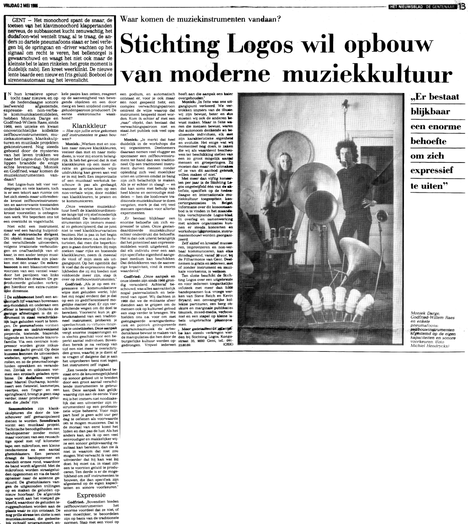 | "Stichting Logos wil opbouw van moderne muziekkultuur" | Mark Ansseeuw | in:De Gentenaar, 2/05/1986 | 1986 | dutch |