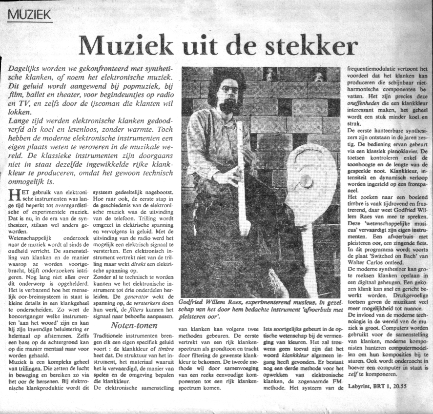 | "Pneumaphones,Dudafoons,Manipulofoons... an interview with Moniek Darge and Godfried-Willem Raes of the Logos Foundation" | Gordon Monahan | in: "Musicworks 30", Winter 1985 , p.3-7,Toronto, Canada | 1985 | english |
