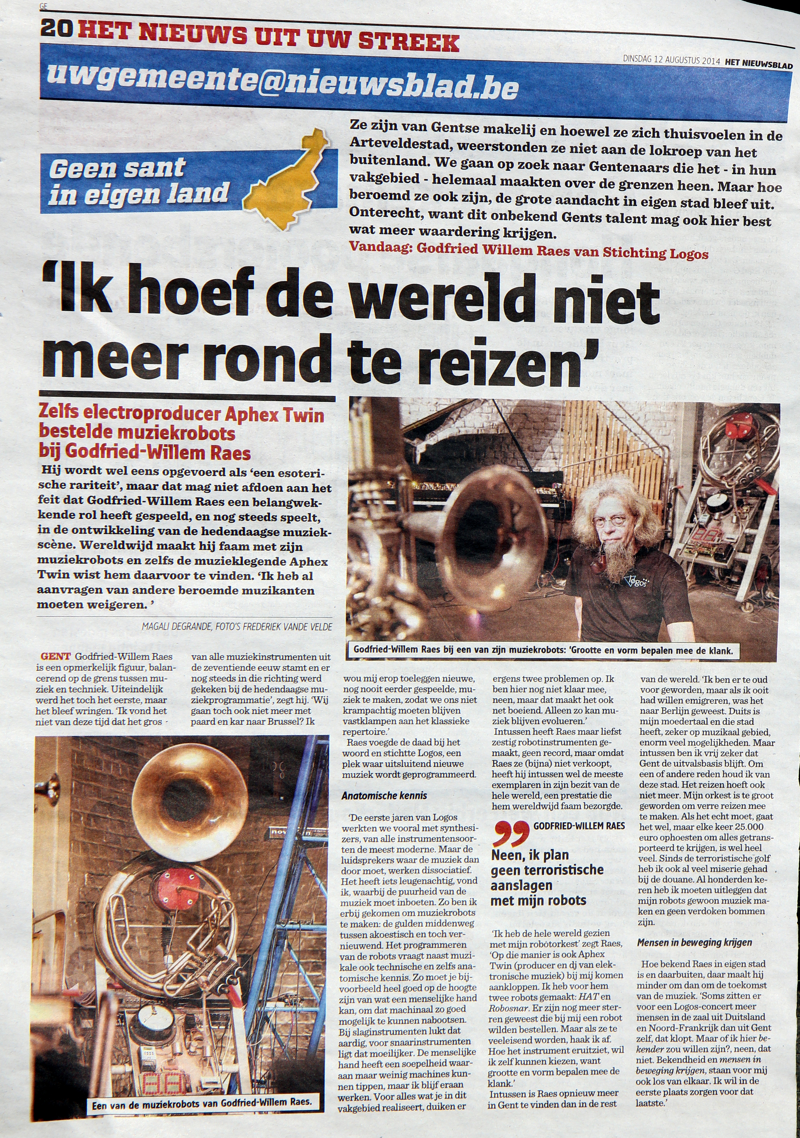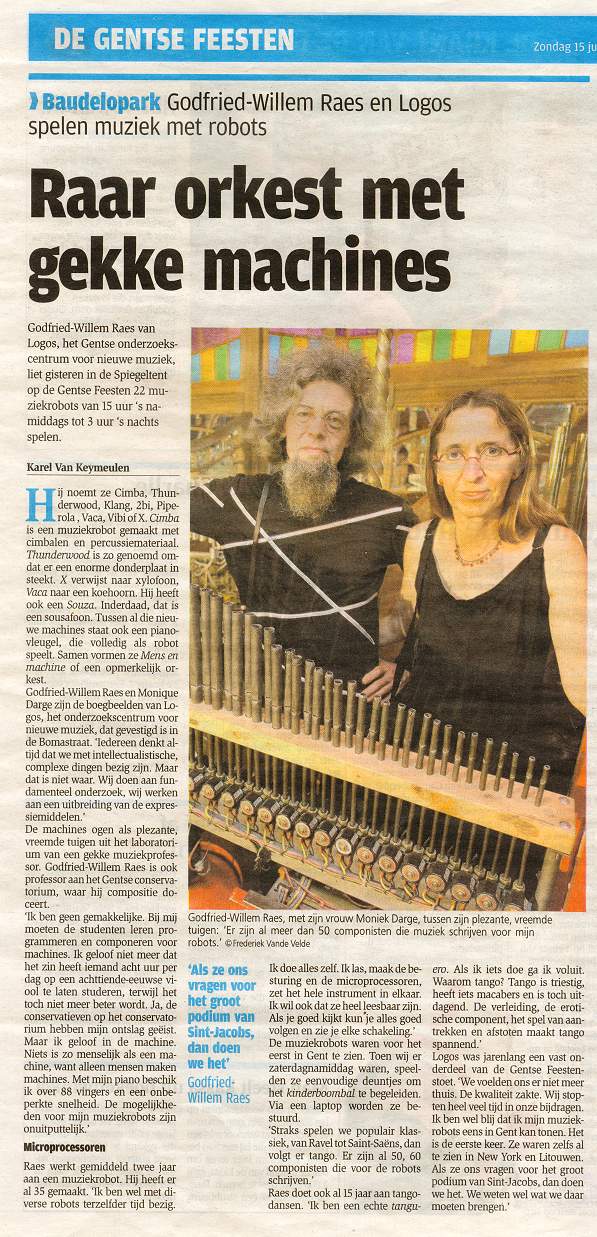 | Interview: Raar orkest met gekke machines: Godfried-Willem Raes en Logos spelen muziek met robots. | Karel Van Keymeylen | De Gentenaar, 15.07.2007, p.25 | 2007 | dutch |