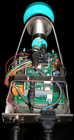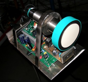 The prototype assembly of the hybrid sensor, baptized HY1, was realized on a sturdy TIG welded stainless steel chassis, with a 3/8" thread at the underside such that it can be mounted on a microphone stand. There are just two connection wires: one for mains power and one for the midi output. The large round component in top is the Pepperl+Fuchs transducer. Under it and assembled in-line, we see the KMY24 Siemens radar sensor. The completed sensor construction can be seen on the pictures following.