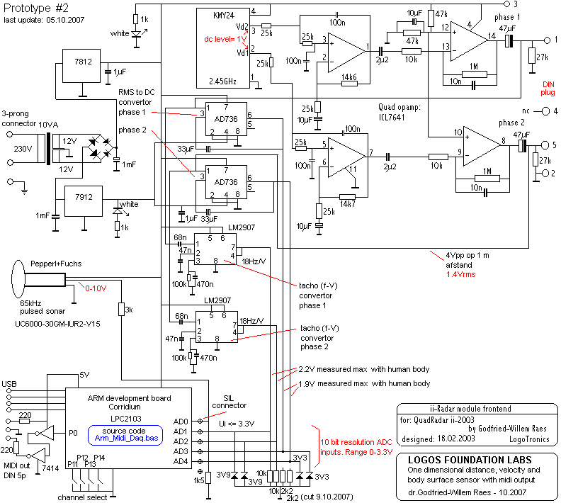(1) This project is part of the ongoing research of the author in gesture controlled devices over the last 30 years. Earlier systems, based on Sonar, Radar, infrared pyrodetection and other technologies are fully described in "Gesture controlled virtual musical instrument" (1999), in "Quadrada" (2003), "picradar" (2004) as well as in his doctoral dissertation 'An Invisible Instrument' (1993). Artistic productions and compositions using these interfaces and devices have been: <Standing Waves>, <Holosound>, <A Book of Moves>, <Virtual Jews Harp>, <Songbook>, <Slow Sham Rising>, <Gestrobo>, <Technofaustus> , "PicRadar Studies" etc. The research is since 2005 supported in part by the Ghent University College (Hogent).
