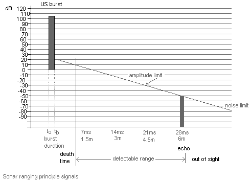 The sampling rate, the shortest possible time between individual distance measurements in all ultrasonic distance sensors is determined by the velocity of sound (ca. 340m/s, although the velocity of sound in air decreases for very high frequencies). This dictates that say for a measurement distance of 3 meter, the time between measurements has to be much larger than 18ms. For single transducer devices this time has to be increased with the required death time between measurements required to discharge as well as damp sensors and for resetting the operational conditions of the input circuitry. Thus the Polaroid sensor is incapable to offer you more than ca 5 measurements a second. Although all of these transducers give out distance data, it is technically very well possible to gather also information on the size of the reflecting surface, since this is proportional to the amplitude of the received echo. This parameter however can only be reliably used if the reflective properties of the surface are not subject to changes between measuments as is usually the case with clothed bodies. This is one of the reasons why all our experiments, artistic presentations and measurements are done using naked bodies. Another very obvious reason is that clothing damps the amplitude of the reflected echo with a factor ranging between -8dB to -18dB as compared to a naked body.