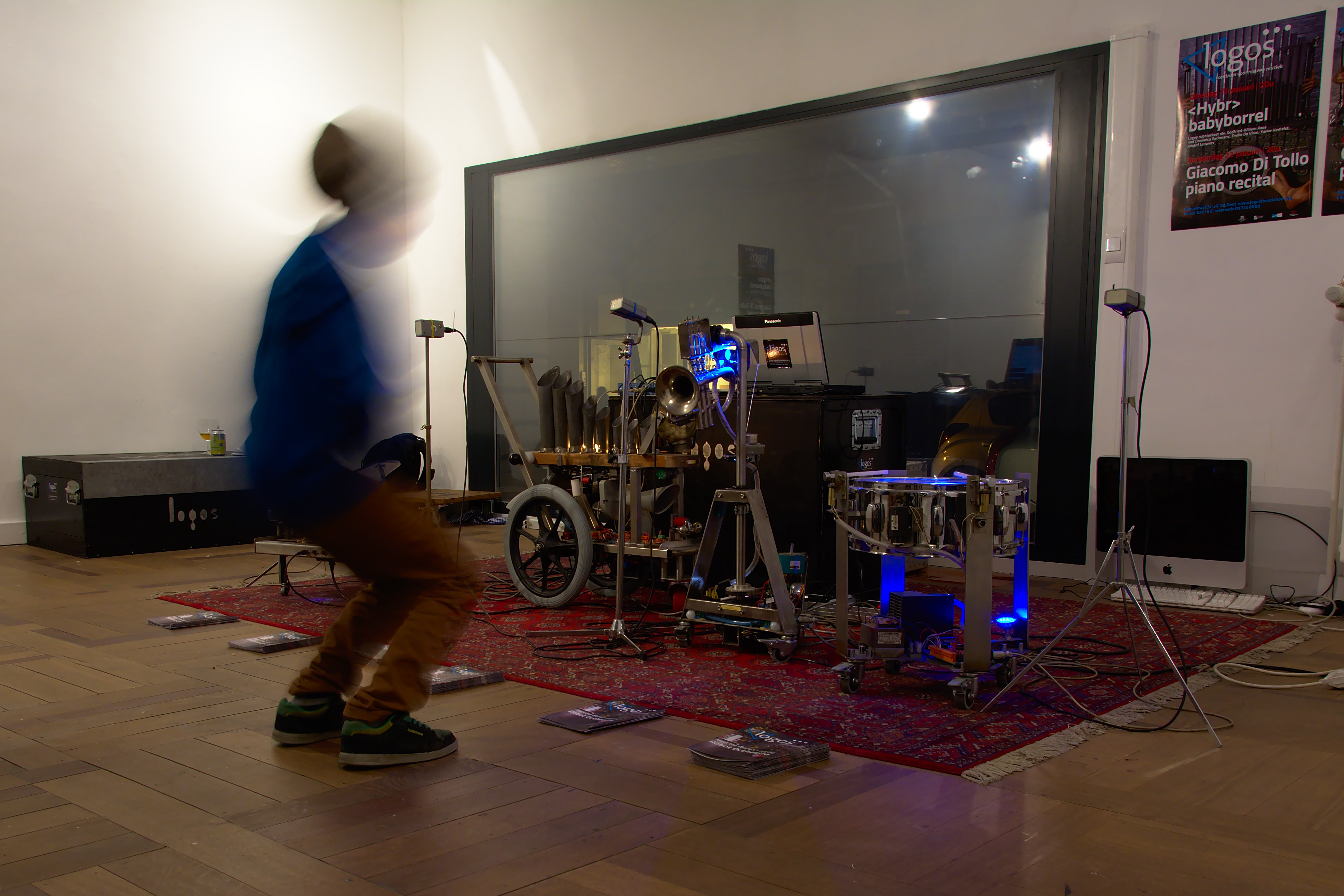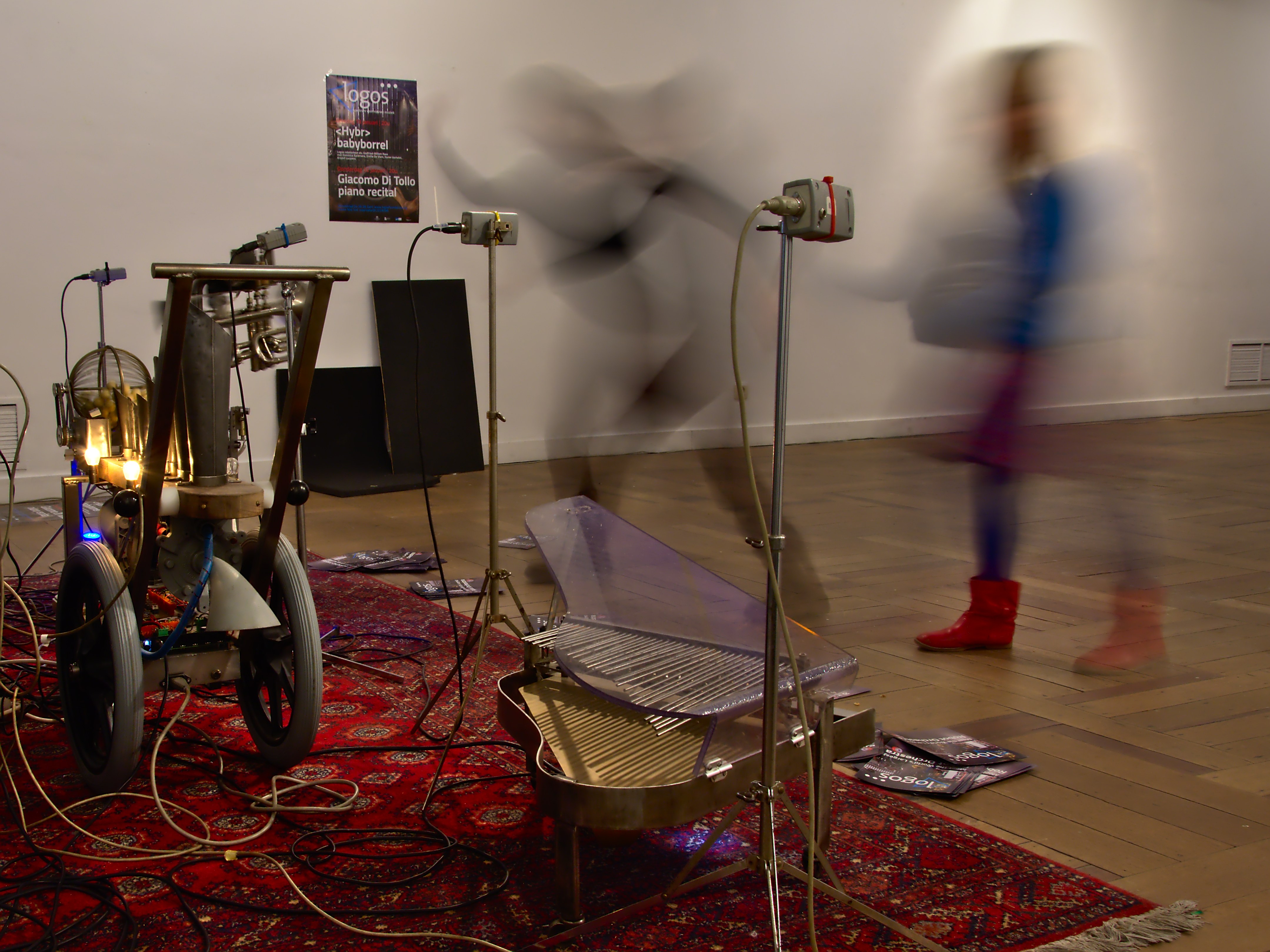 [Nicoletta Brachini, Moniek Darge and Godfried-Willem Raes in 'Views on the stuppa' by Kristof Lauwers and Moniek Darge, using the Picrada interfaces for playing our <Llor> robot. Gent, 2004].