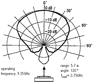 Signal amplitudes are inverse proportional to the square of the distance to the antenna and directly proportional to the size of the surface of the moving body. (6) The detection range for these devices is limited to 5 – 7meters, somewhat smaller than in case of the quadrada setup. Noise limits the range of the unit. Since we want the device to operate in real time, there is no way to resolve signals below or around the inherent noise level of the devices. The polar sensitivity, according the the datasheet, shows an opening angle of 60° (within -3dB). The polar diagram below conforms to our measurements in july 2004.