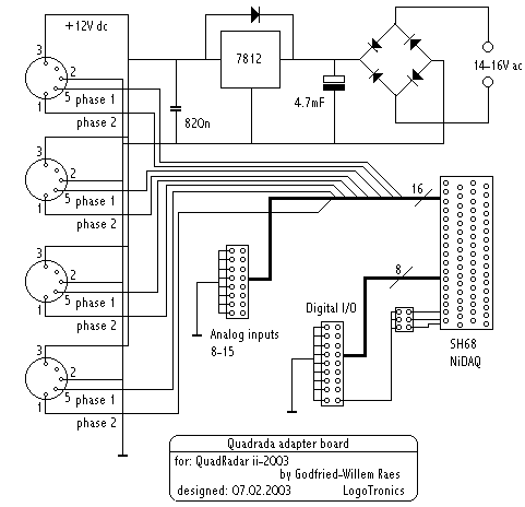 2. Adapter board to connect the outputs from these 4 devices to 8 A/D channels of a National Instruments PCMCIA data acquisition card (We use a DAQCard AI-16E-4, a 12bit 500kS/s device). This board also houses a linear stabilized power supply for the transducers. These require 12V dc and draw about 40mA each. This brings the total power requirements, including some safety margin to 12V/ 300mA, or no more than 4Watt. Standard 5pole 180° DIN connector cabling is used for the interconnections. A 68 pin (4 rows) male connector is provided to enable easy connection to the National Instruments PCMCIA DAQ card.