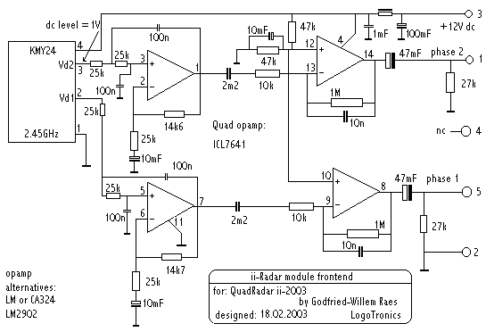 These make use of microwave sensors produced by Siemens under typenumber KMY24 or HFMD24. These modules make use of a BFR92P oscillator coupled to a dual mixer: