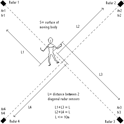 The other pair of radars, 2-4, will similarly lead to the derivation of a value for S. Depending on the orientation of the moving body, this value will be different. The proportion between both values allows us to derive the orientation of the body within the square coordinates. Thus some information with regard to the shape of the moving body can be retrieved as well: the values of the size of the moving surface as seen by the radars 1 and 3 , and these seen by radars 2 and 4 will depend on the orientation of the moving body in the space: Since front and backside of a human body show more or less a twofold surface as compared to its sides, we can estimate the orientation or aspect of the moving body using this equation:
