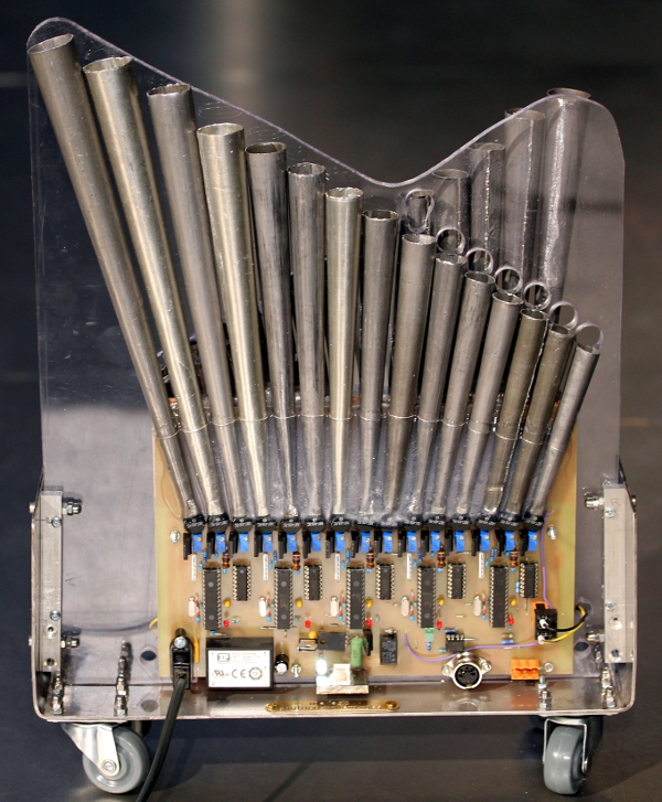 To make and calculate the required conical pipe resonators we first made a bunch of test-pipes of different lengths and measured them out carefully using our Tektronix arbitrary function generator. After collecting the data, we wrote a small computer program to calculate by logarithmic interpolation the required pipe lengths for the practical instrument. It was observed that the pipes resonate as 1/4 wavelength resonators for all pitches below the resonant frequency of the buzzers. As for the highest notes on <3Pi> the cones became too short to sound well, we decided to construct all the pipes on the second board, as 1/2 lambda resonators.