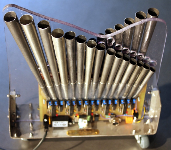 In contrast with the two previously built miniature organs, this one was designed to use conical resonators. In traditional organs, cone resonators are exclusively used in combination with reed pipes. Registers such as trumpet, oboe, bassoon, tuba... have conical resonators. These resonators are not strictly tuned, as the tuning is merely dependent on the reed, but are used and adjusted to obtain the specific timbre for the register. One may encounter them as 'full length', 'half length' or quarter length, but the exact lengths are not tuned. Trumpets with full length resonators do sound really powerfull. As the cones are taken shorter and wider, the tone becomes more sharp and piercing.