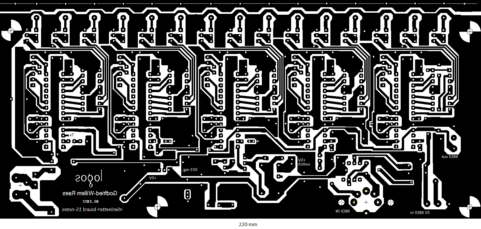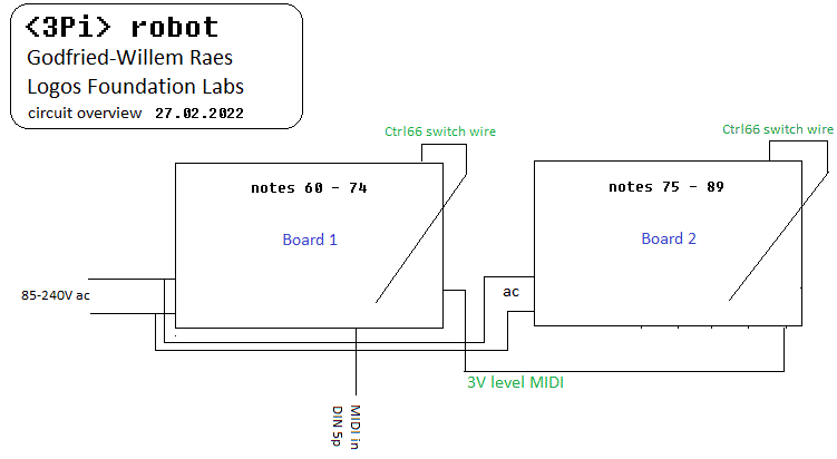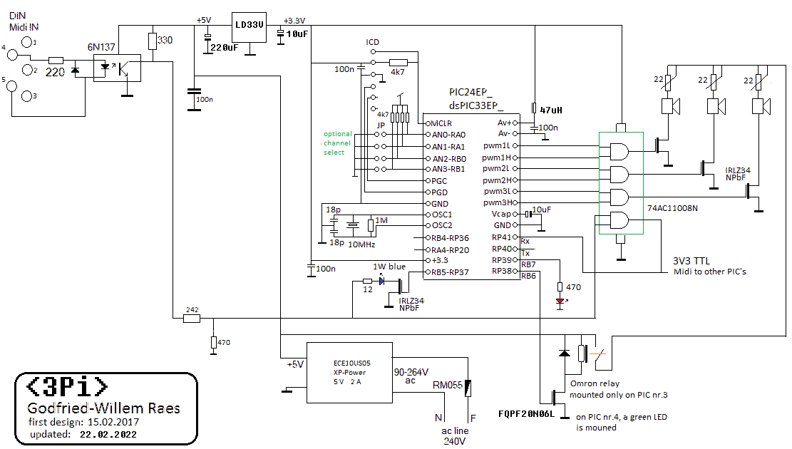 For driving and tuning the buzzers we designed a circuit build around the microchip Pic 24EP128MC202 microprocessor, in fact a chip developed as a dedicated 3-phase motor controller. The circuits are in principle identical to the ones used for <Pi> and <2Pi>, but the PCB boards were redesigned and improved on some details. Here we have only two PCB's, each serving 15 notes. All sound synthesis is handled in the digital domain using PWM techniques. On each processor chip, three 16-bit timers are used to generate the required pitches with variable duty cycles. The three PWM channels working at a base frequency of >300kHz are used for the envelope control of each individual note by multiplying their output with the variable duty cycle square wave signal from the tone generators. No low pass filtering was applied, as all possible artifacts are situated well above the normal auditory perception range. Moreover, the coils driving the membranes serve as an intrinsic low pass filter due to their inductance (900uH). We considered using analog control for the global volume control of the instrument as the power supply voltage for the buzzers controls directly the sound volume leading to a possibly better resolution in dynamics. However, after some experiments we dropped the idea mainly because it would introduce a high risk of overloading the buzzers if the instrument were given in the hands of not knowledgeable musicians. The current through the buzzers should be limited to 75 mA.