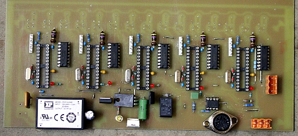 Here is the circuit design (shown for 3 notes only, but the practical circuit on a single 100 x 220 mm board, houses 5 processors, good for 15 notes):