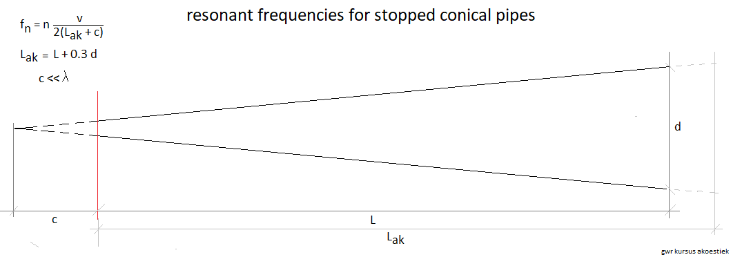 The value to be taken for c, after a series of measurements, came out a ca. one thirth of c. It therefore seems that the pipe at the truncation of the cone, behaves as if the cone is coupled to a cylinder with the same volume as the virtual cone with length c. Hence our finding that Lak = L + 0.3d + c/3. Here is an improved drawing, at the base of our final calculations: