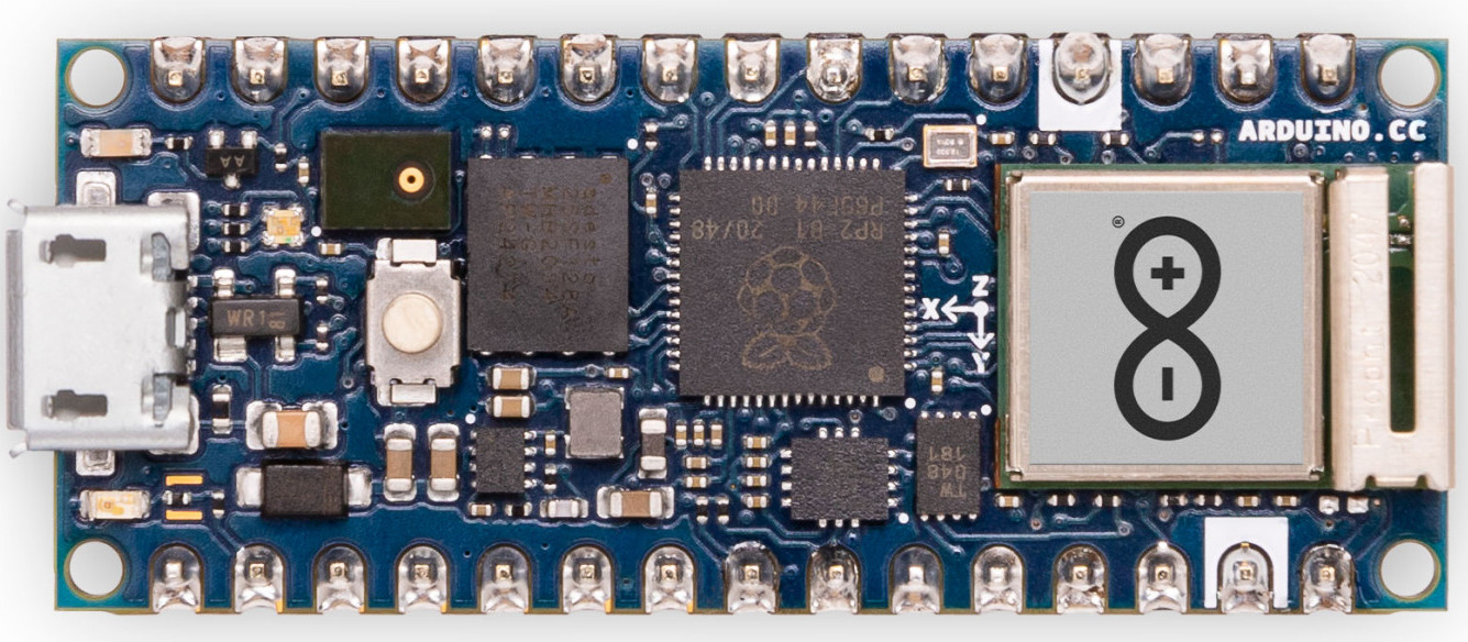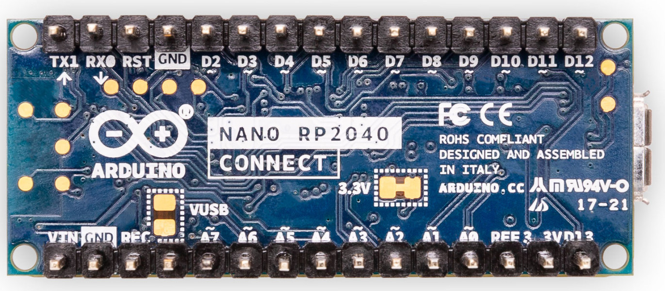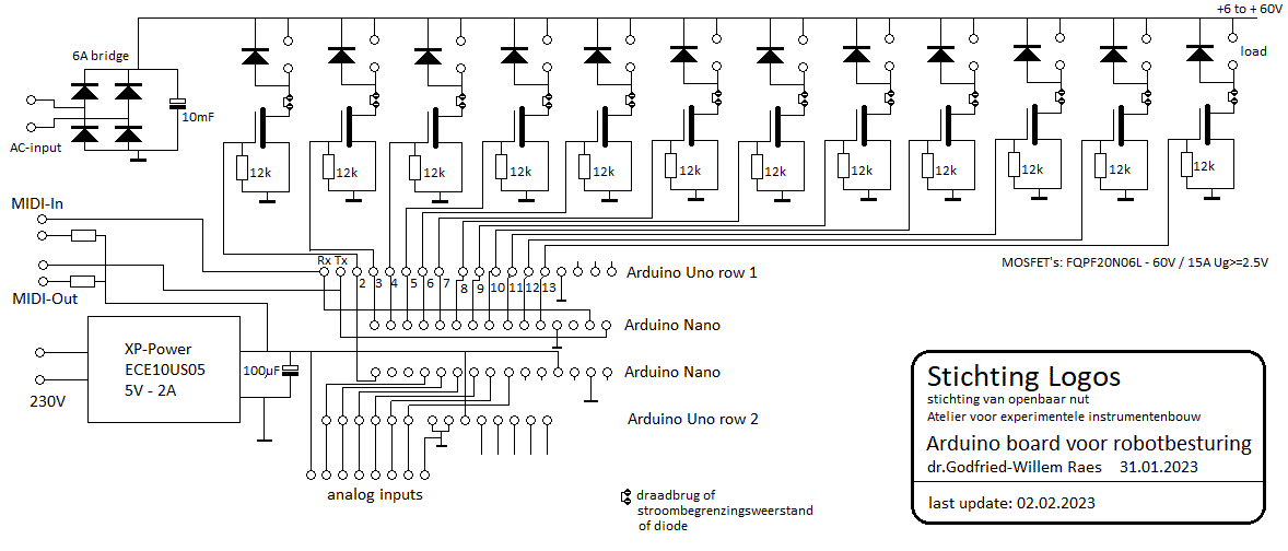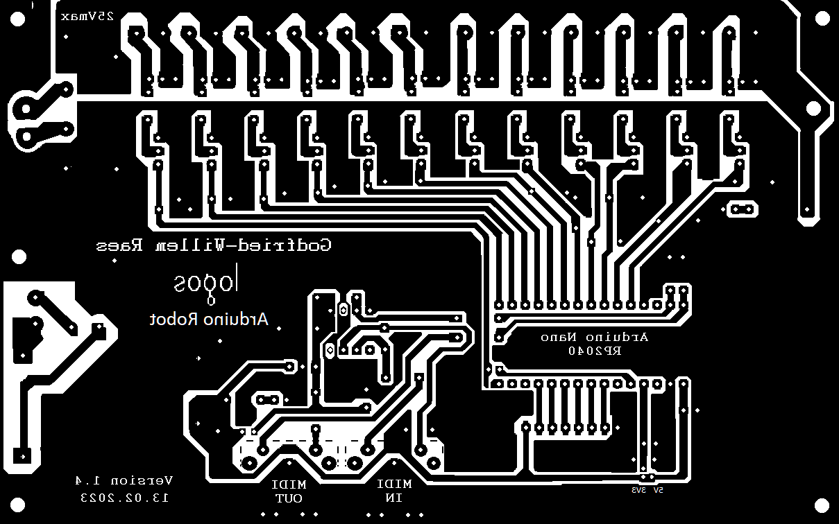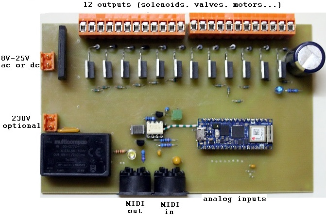 We ontwierpen een eenvoudig enkelzijdig PCB voor de besturing van twaalf ventielen of elektromagneten. Muzikaal gezien zijn daarmee alle noten van een oktaaf polyfoon te spelen. Beide Arduino boards kunnen gebruikt worden, weliswaar mits de nodige aanpassingen in de kode, want de mapping van de pinnen is verschillend. Van het Arduino Nano board bestaan heel wat verschillende versies: de Arduino Nano RP2040 heeft zelfs een 32-bit ARM Cortex processor en vertoont heel wat gelijkenis met de Raspberry Pi. Alle versies kunnen gebruikt worden, al zijn die 32-bit versies hier bepaald wel overkill. (Hoewel...: wie een robot zou willen bouwen waarmee twaalf snaren elektromagnetisch tot trillen kunnen worden gebracht, is met deze processor en ons bordje wel aan het goede adres.) Zo ziet de RP2040 versie eruit: