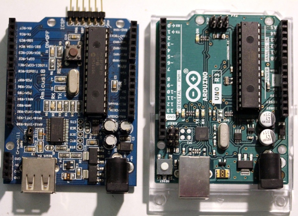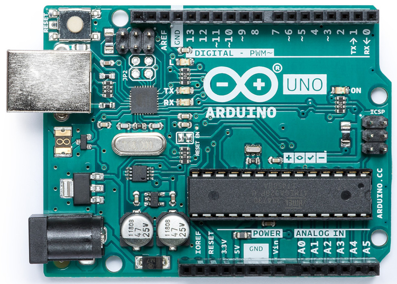 Gezien de enorme populariteit van het Arduino platform stonden de begeleidende leerkrachten erop dat we de bouwprojekten zouden doen gebruik makend van eenvoudige arduino's. Voor ons betekende dat natuurlijk een zekere vorm van downgrading, aangezien de processoren waarmee we de laatste jaren aan het werk waren voor de bouw en ontwikkeling van onze robots, heel wat geavanceerder zijn. Anderzijds hadden we natuurlijk ruim wat ervaring met eenvoudige 8-bit processoren aangezien we die in het laatste decennium van de 20e eeuw voor bijna alle toen ontwikkelde robots gebruikten.De traditionele Arduino boardjes maken echter gebruik van Atmel processoren, type ATMEGA328P die weliswaar veel gelijkenis vertonen met de Microchip PIC processoren, maar beslist niet kode-compatibel zijn met deze laatste.Arduino Uno R3: revisie 3 van het oorspronkelijke Arduino board. Ook de 'leonardo' versie kan gebruikt worden.