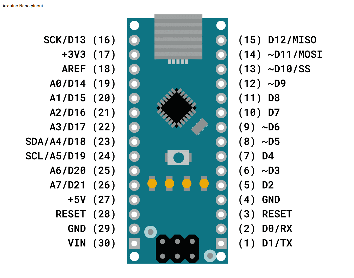 Arduino Nano: zelfde processor, maar veel kleiner board en intern voor bepaalde recente types alleen werkend op 3.3 Volt, hoewel een 5V aansluiting voor de voeding volstaat. De boards kunnen ook uit een USB connector gevoed worden. De pinning is: