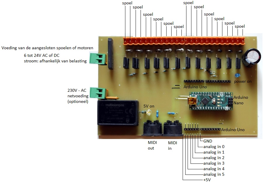 Een Arduino sketch die midi-in (met buffering en parsing) en midi-uit ondersteund en toelaat de 12 elektromagneten met geimplementeerd velocity-byte aan te sturen is hier downloadbaar. In deze sketch, geschreven in C++, werden de 12 spoelen gemapt op de noten 60 tot 71. Het midi kanaal is vast ingesteld op 0, maar kan uiteraard in de kode gewijzigd worden. Een probleem waarmee alle Arduino boards opgescheept zitten is dat de USB poort die we elegant kunnen gebruiken voor voeden en programmeren gebruik maakt van de UART op de chip. Daardoor is het heel moeilijk diezelfde UART ook voor andere doelen -zoals in ons geval MIDI- beschikbaar te krijgen. Wanneer we een ATMEL programmer gebruiken, aangesloten op de 6-polige header op het Arduino board, kan het probleem opgelost worden. Nooit echter kan de USB poort samen met de Tx/Rx pinnen op de Arduino gebruikt worden. De dokumentatie van Arduino zelf rept met geen woord over dit probleem dat ons toch vele uren zoekwerk heeft gekost... De Arduino Nano RP2040 kent dit probleem niet, maar daarvoor moet de code aangepast worden door Serial1 te gebruiken in plaats van Serial. Hier is de sketch voor dit board.