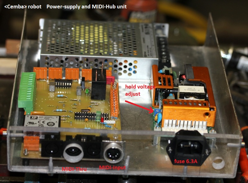 De elektromagneten hebben een DC weerstand van 27 Ohm. Bij 12 V (de nominale spanning voor 100% duty cycle bedrijf) trekken ze 444 mA, een vermogen van 5.5 W. Indien we clusters van 54 noten mogelijk willen maken, moet de 12V voeding gedimensioneerd worden voor 24 A, een 300 Watt voeding zou dan nodig zijn. Aangezien de opgemeten houdkracht van de elektromagneten bij een spanning van 9 V (de stroom is dan 333mA) door meting bepaald kon worden op 2 Newton -ruim voldoende om de toets naar beneden te houden- kunnen we bij toepassing van een kleine 9 V 100 W voeding van XP-Power, nog steeds 33 noten polyfonie ondersteunen. Meer dan driemaal zoveel dan wat een mens zou kunnen. Voor de berekening van de voeding voor de velocity pulsen moeten we vertrekken van het gegeven dat een noot-aan kommando (3 bytes) in MIDI 1 ms vergt. Wanneer de velo pulsen 10 ms duren, kunnen we dus maximaal 10 pulsen tegelijk van stroom te voorzien hebben. Bij een pulsspanning van 15 V is de stroom gedurende de puls 12 V + 15 V / 27 Ohm = 1 A. Een voeding met een stroom van 10 A moet derhalve volstaan. Bij 15V pulsspanning en 9V houdspanning wordt dit 24 V / 27 Ohm = 888mA.