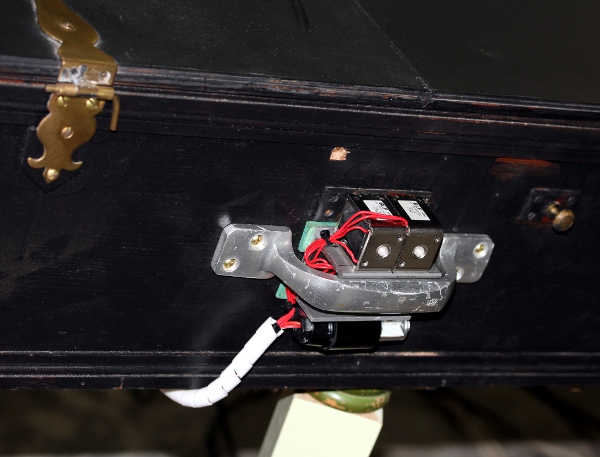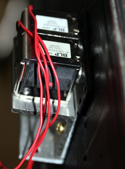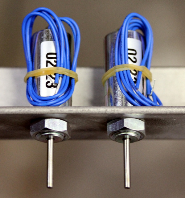 2.- gebruik van twee bidirectionele elektromagneten. Gezien de nodige kracht, moeten we in dit geval vrij grote magneten gebruiken die we dan -zoals in bovenstaand geval met de motoren- elk langs een andere kant van het instrument moeten monteren. De breedte van het instrument zou dan met minstens 40 cm vergroot worden. Het risico op beschadiging tijdens transport wordt daardoor bijzonder groot. Een bijkomend probleem is dat we niet direkt een leverancier of fabrikant weten die dergelijke elektromagneten met een traject van maximaal 2 a 3 mm in zijn leverprogramma heeft.