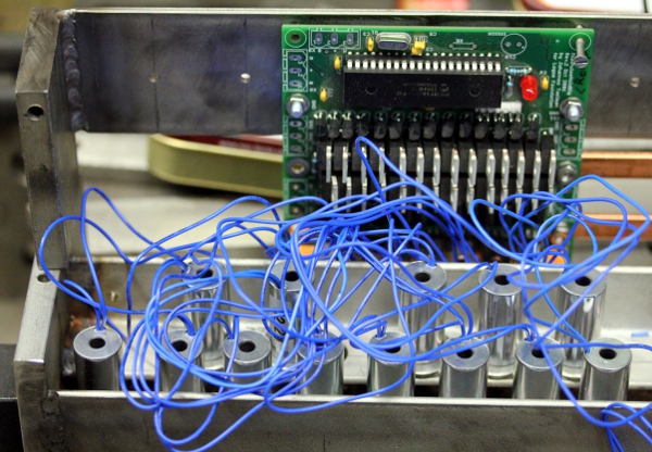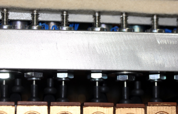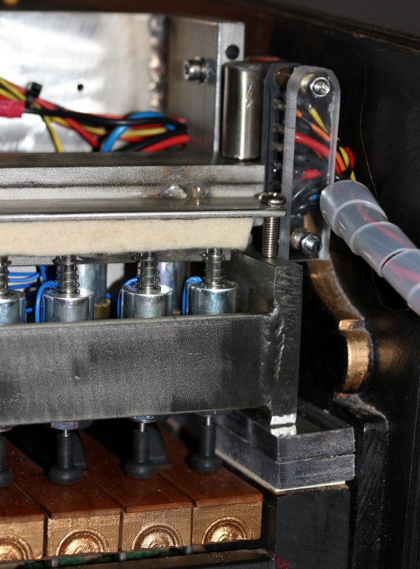Om wat meer ruimte voor het mechanisme te scheppen, verwijderden we de vertikale afdekplank -mogen we dat een boenselplank noemen?- bij het einde van de speelkant der toetsen. Deze heeft geen enkele muzikale noch akoestische funktie. De Vorsetzer wordt opgebouwd met twee lengtes 30 x 30 x 3 inox profiel voorzien van 11.5 mm gaten (voor 7/16 - 20 tpi, schroefdraad) voor de elektromagneten. De twee profielen worden vastgelast op de 10 mm dikke zijkanten met een hoogteverschil overeenkomend met het hoogteverschil tussen de witte en de zwarte toetsen (11 tot 12 mm). Het laswerk voerden we uit met manuale TIG techniek. We gebruikten uitsluitend roestvast staal voor de gehele konstruktie.