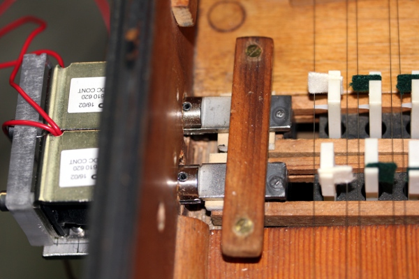 Puur technisch gesproken, zou de beste oplossing erin moeten bestaan de dokjes van onderuit met de elektromagneten omhoog te duwen op de plaats waar de toetsen dan normaal gezien doen. Daarvoor moet het hele keyboard blijvend weggenomen worden. Maar, zonder toetsenbord wordt het wel moeilijk tot omslachtig om het klavecimbel te stemmen, want om dat dan te doen zouden we telkenmale een midi-keyboard ofwel een komputer met midi-interface moeten aansluiten. Snel wat bijstemmen is dan niet meer aan de orde. Ook de alternatieve mogelijkheid om de dokjes aan hun bovenkant met elektromagneten omhoog te trekken bestudeerden we grondig. Bezwaren daartegen zijn enerzijds dat het schroefje waarmee de demper op het dokje wordt afgeregeld dan niet meer bereikbaar is. In het gat voor die regelschroef moeten we immers draad tappen waarmee het dokje aan het anker van de elektromagneet wordt bevestigd. Een tweede bezwaar is dat het erg moeilijk wordt om het mechanisme te verwijderen en terug te plaatsen. De ankers zitten immers vast op de dokjes en de spoelen moeten dan met 54 tegelijk en zuiver in register over de ankers worden geschoven... geen sinecure. Voor <Spiro> beslisten we de elektromagneten in te zetten voor het omhoogduwen van de achterzijde van de toetsen. Het probleem daarbij was, dat we maatregelen dienden te nemen om te verhinderen dat de hele toets omhoog werd geheven eerder dan haar te doen omkiepen. De pennen waarop de toetsen bewegen voorzagen we van een stop om dit te verhinderen. Voor <Sper> konden we dit probleem vermijden door een Vorsetzer te ontwerpen. Voor <Cemba> echter kregen we af te rekenen met een bijkomend probleem: dit instrument heeft twee registers, waardoor de dokjes niet star boven de toetsen komen te liggen en het omhoogduwen van de dokjes van onderuit ook onmogelijk is.