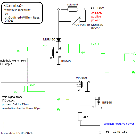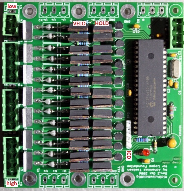 Key pressure: implemented for automatic note repeats. The repetitions rate can be different for each individual key. [we ommitted this feature in the final design, as fast repetitions on notes are potentially very destructive for the instrument. If required, there is a metacompiler command in the PIC sourcecode, wherewith it can be re-enabled.].