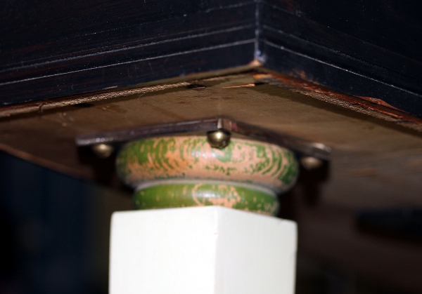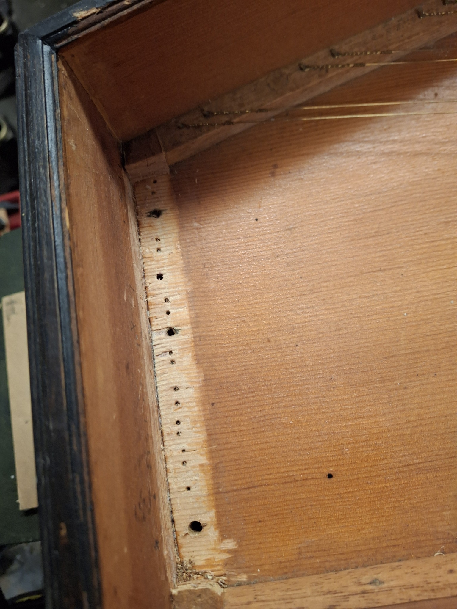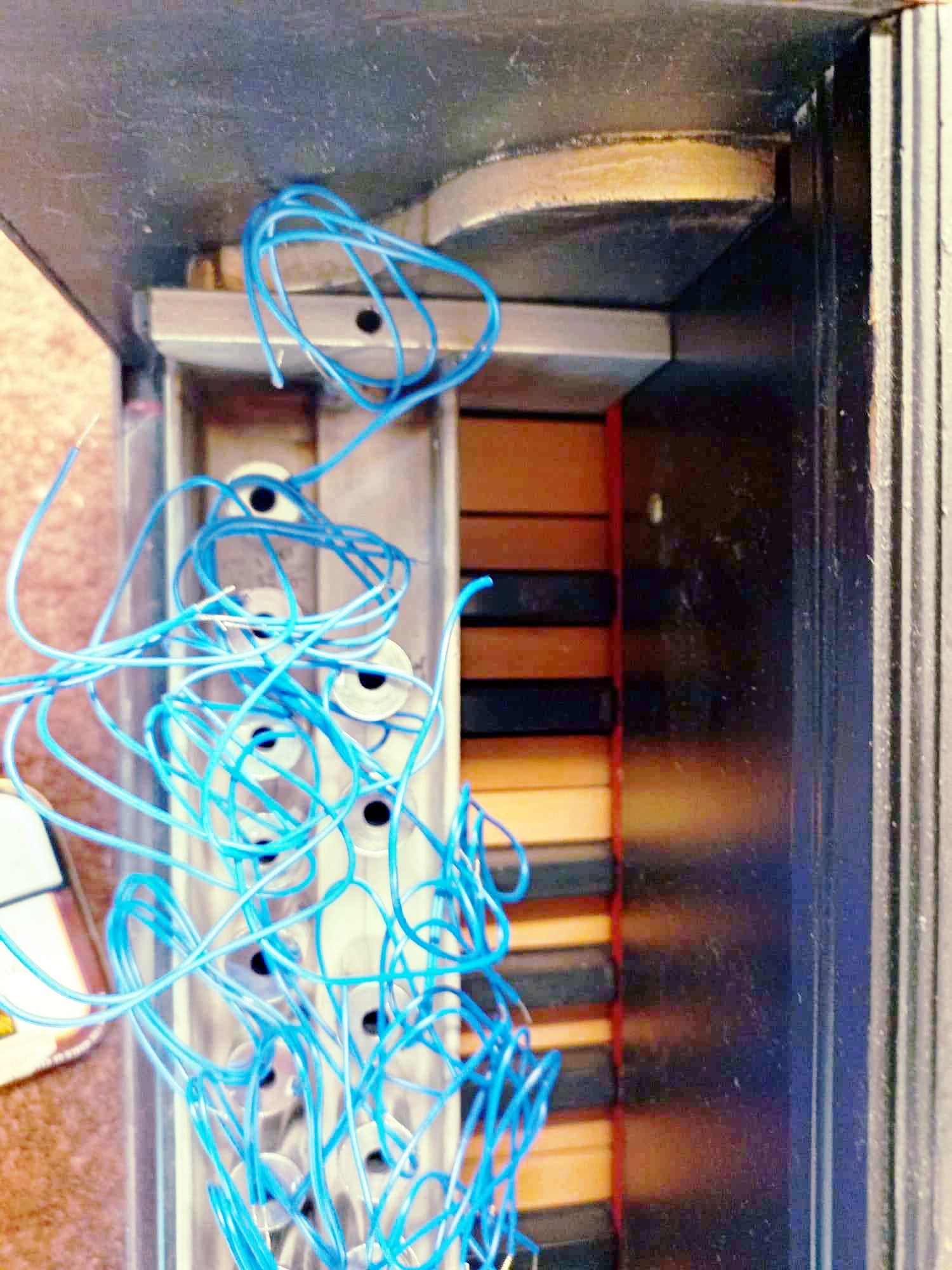 Voor het wegnemen van de vorsetzer evenals voor het verwijderen van de slede met de voedingen en de besturingscomputer, moet de stroom volledig uitgeschakeld worden. Ook voor het wegnemen van de demperlat -nodig bij het stemmen van de chromatische noten van het instrument- raden we sterk aan de stroom volledig uit te schakelen. Op die wijze kan vermeden worden dat vallende metalen werktuigen en/of onderdelen kortsluiting zouden kunnen veroorzaken... Let op: er zit een los drukveertje onder de demperlat! Laat het niet verloren gaan. Probleem is wel dat zonder stroom geen registers kunnen ingeschakeld worden, met wat omzichtigheid echter is het goed mogelijk de besturing ingeschakeld te laten tijdens het stemmen. We voorzagen bovendien twee uitstekende stukjes hout, vastgekleefd op de dokkenlijsten aan de rechterkant waarmee de registers ook handmatig kunnen bewogen worden.