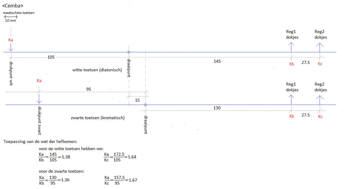 De bouw leverde wel wat moeilijkheden van ontwerptechnische aard op. Aanvankelijk hadden we alle spiraalvormige terugkeerveertjes op de elektromagneten helemaal verwijderd. Uit proeven was namelijk gebleken dat dit de repetitiesnelheid zeer ten goede kwam. Maar... omdat het nochtans erg kleine gewicht van de ankers zo permanent op de toetsen kwam te liggen, kwam de demping van heel wat snaren bij het loslaten van de toets in het gedrang. De voor die demping nodige kracht bleek tot overmaat van ramp, heel erg verschillend te zijn van toets tot toets en volkomen afhankelijk van de afregeling van de dokjes. Dit noopte ons ertoe alle veertjes opnieuw aan te brengen. Het daardoor geintroduceerde probleem was nu, dat het hele mechanisme erg luidruchtig werd omdat bij het lossen van de toetsen, de ankers vrij konden 'dansen' op het aanraakvlak van de toetsen. Om dat rammelende euvel op te lossen konstrueerden we een dubbele met dik vilt beklede demperlat, waarmee de veerresonanties grotendeels konden worden gesmoord. Een volgend probleem waarmee we te maken kregen was de ongelijkheid van de nodige aanslagsterkte voor de zwarte versus de witte toetsen. De verschillende lengte van de hefbomen, die de toetsen uiteindelijk toch zijn, maakt dat er een krachtverschil is van enkele procenten. Dit losten we op door kompenserende velocities uit te sturen voor de kromatische en de diatonische tonen. Een verder inherent probleem was dat de aanslagkracht ook een funktie is van de snaarlengte. Voor de lage -en dus lange- snaren is alweer iets meer kracht nodig. Tenslotte kregen we ook nog af te rekenen met het -op zich simpel in te zien- verschil in aanslagsterkte in funktie van de registers. Immers wanneer een toets twee snaren moet tokkelen, is een dubbel zo grote kracht nodig dan bij een enkele snaar. Om die trouwens worden klavecimbels vaak zo afgeregeld dat wanneer twee registers aktief zijn, de plektra op een iets anders moment de respektievelijke snaren aantokkelen. Dit wordt ook heel goed beschreven in het boek van Hans Neupert, vermeld in de bibliografie onderaan deze webpagina. Dat is bovendien ook goed hoorbaar wanneer een toets heel traag wordt ingedrukt. Uiteindelijk slaagden we erin al deze parameters in de firmware in te bouwen waardoor die met recht en reden 'smart' kan worden genoemd. Een laatste, maar eigenlijk voor ons zo goed als onoplosbaar probleem heeft te maken met onderlinge verschillen in kracht naargelang de lengte van de plektra in de dokjes. Onoplosbaar, omdat dit geheel afhangt van de nauwkeurigheid waarmee de speler of instrumentenbouwer die plektra snijdt. Voor wie het allemaal wil narekenen, hier een gedetaileerde maatschets voor dit klavecimbel: