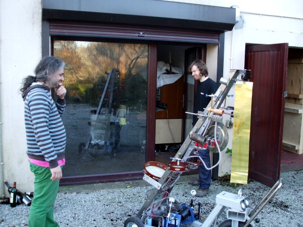 Next to the beater mechanisms, we could not resist in providing also a shaking mechanism. This idea builds further on the experiences gained during the construction and use of our earlier <Thunderwood> (this one has wood chimes and a large thundersheet) and particularly the <Psch> robot. The last one uses only shaking mechanisms.