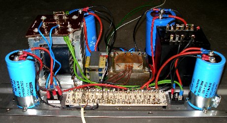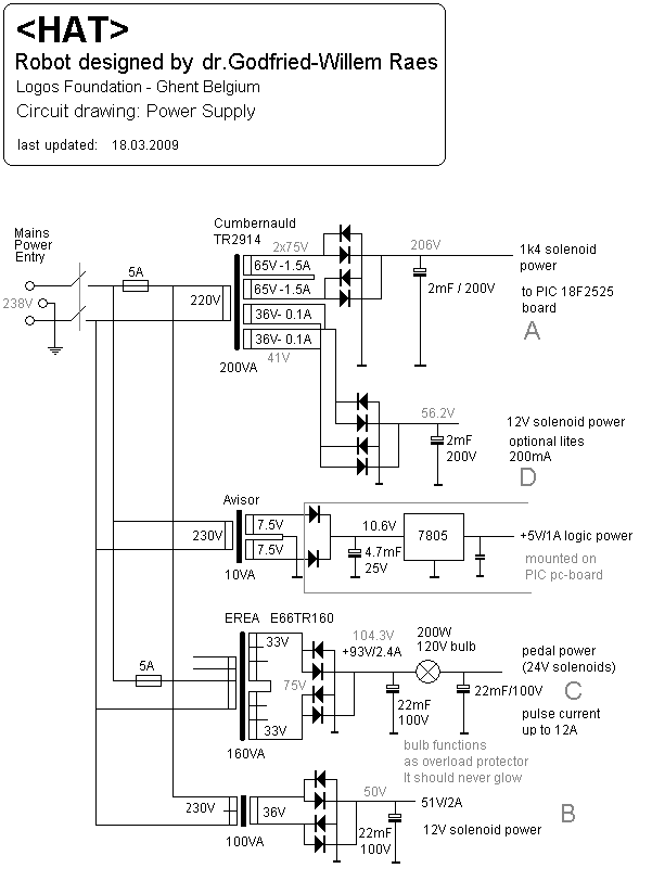 Note that the power supply carries dangerous voltages. Before servicing, switch off the robot and give it 10 minutes rest, to enable the hefty capacitors to discharge. The connections on the power supply module are laid out as follows: