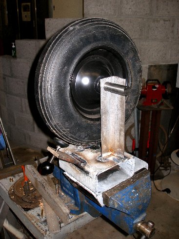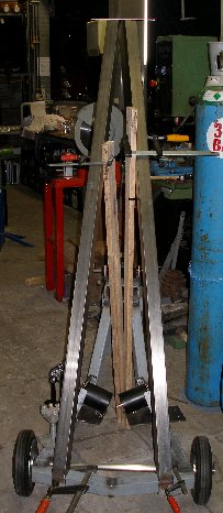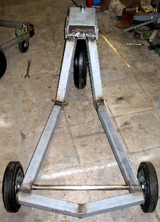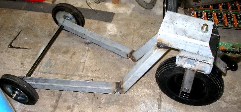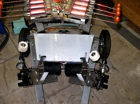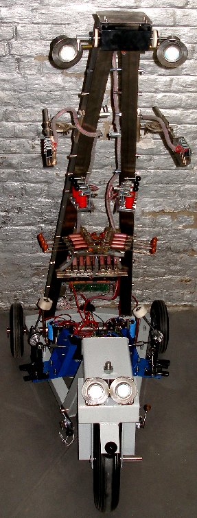 Aangezien een gammele en rammelende konstruktie voor zo'n ontwerp volstrekt uit den boze is, ontwierpen we voor deze robot een gelast chassis uit uiterst stevig profielstaal en voorzagen we dit van een onverwoestbaar stevig wielstel. Daarbij werd voor een driewiel konstruktie geopteerd, omdat zoiets per definitie altijd stabiel staat. Zoals in vele van onze robots speelt ook hier weer de hoek van 60 graden een konstruktief zowel als estetisch belangrijke rol.